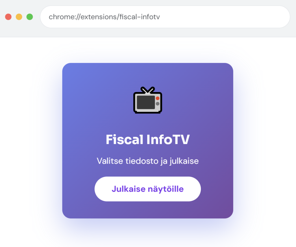 Ilmainen Chrome- ja Edge-selainlaajennus, jolla julkaiset kuvia, PDF-tiedostoja ja videoita Fiscal InfoTV -näytöille yhdellä klikkauksella.